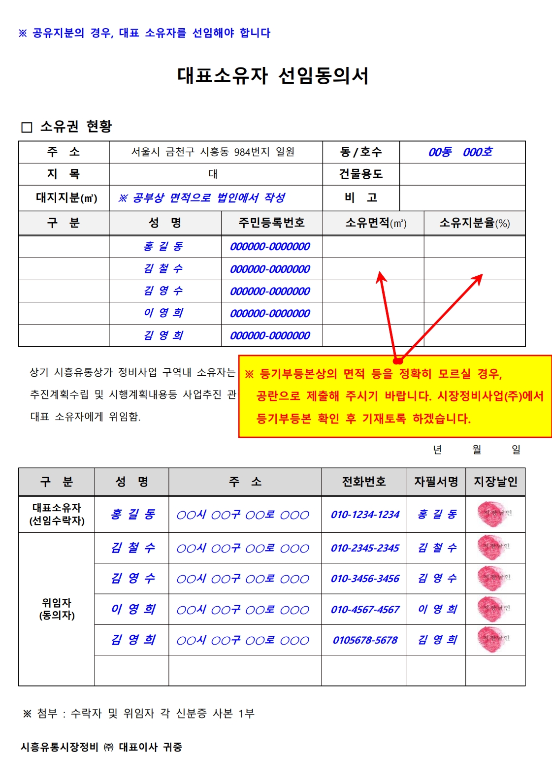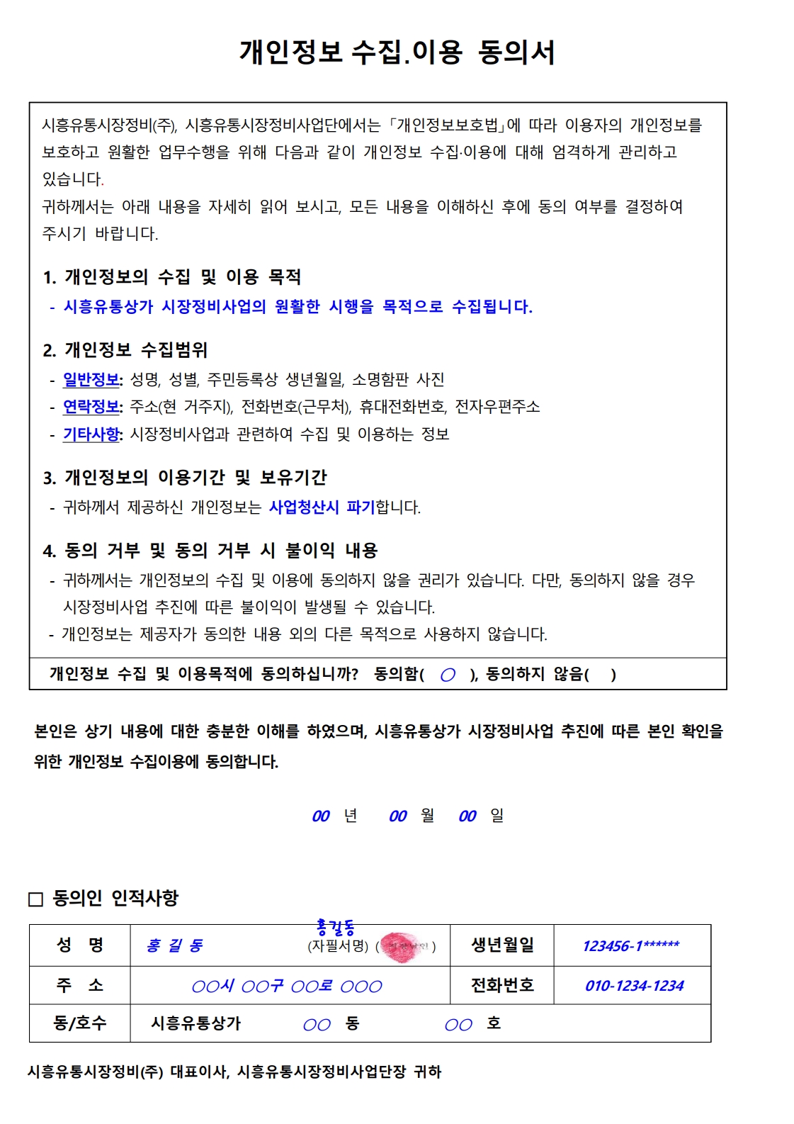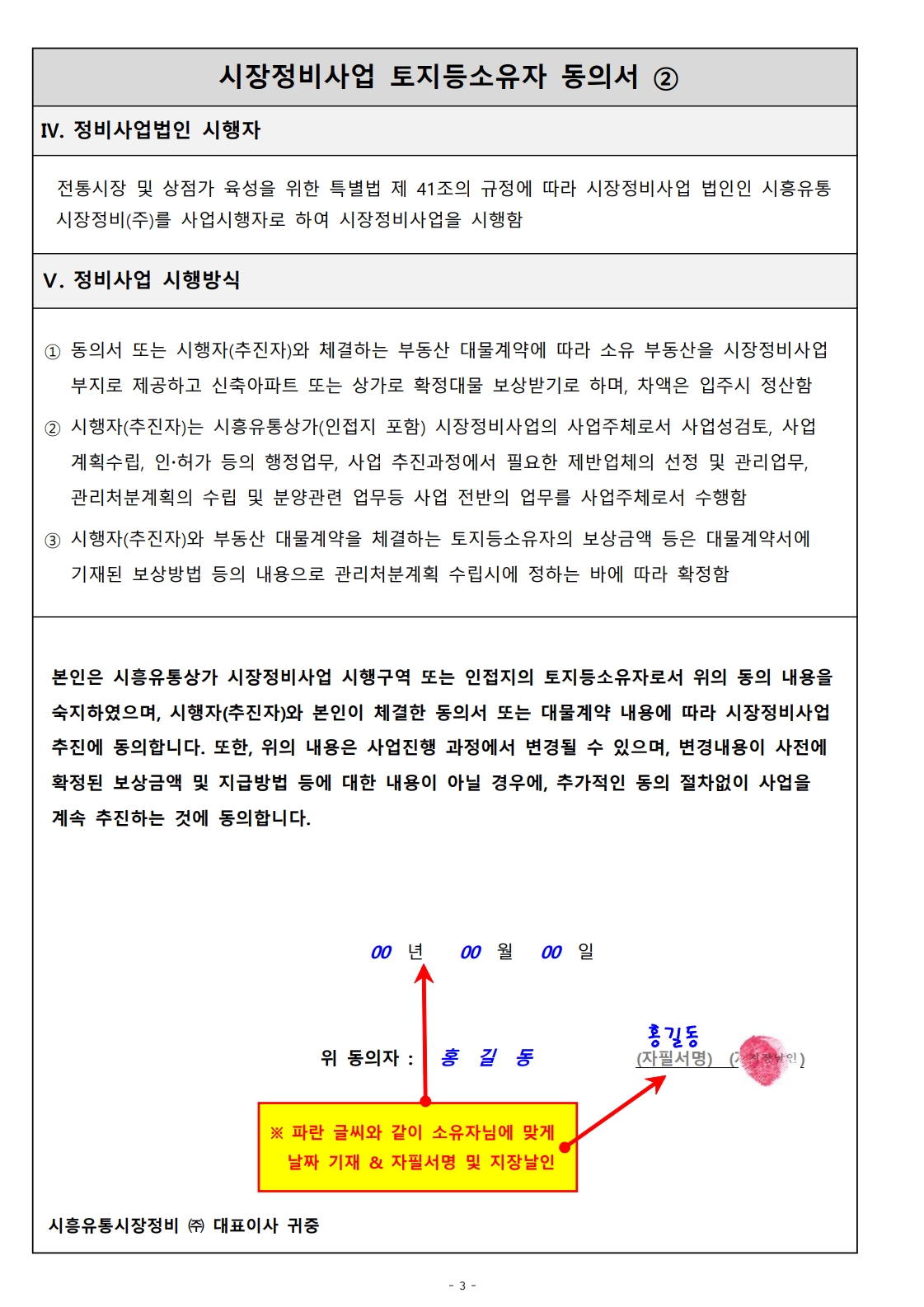 Business 동의서 작성방법 시흥유통상가 시장정비사업 동의서 작성예시 PART 01 _ 동의서 본문 ─────────────────────────────────────── PART 02 _ 대표소유자 선임동의서 (공유지분의 경우 작성) ─────────────────────────────────────── PART 03 _ 개인정보 수집 및 이용 동의서 ───────────────────────────────────────