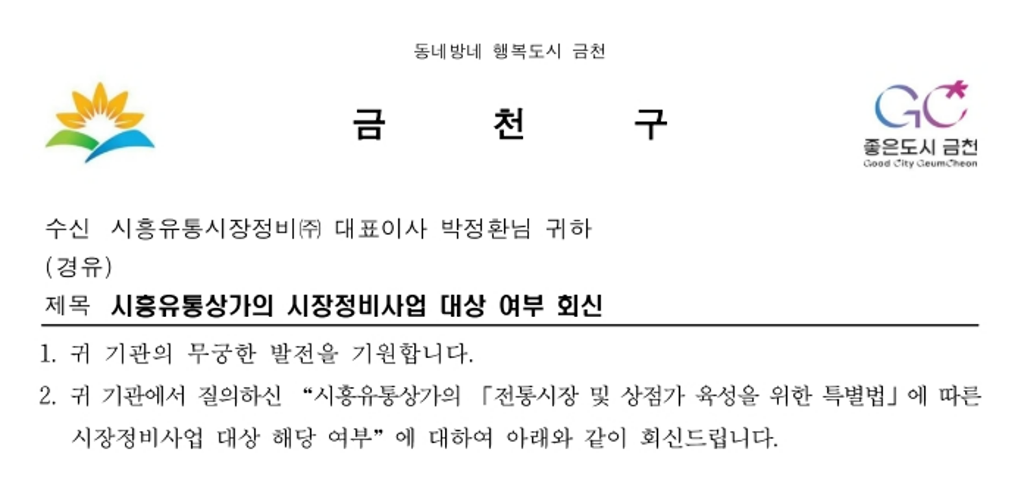 시흥유통상가는 시장정비사업 대상 시장임을 회신받았습니다!