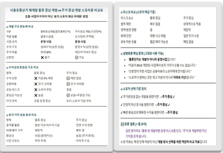 시흥유통상가 물류 중심 개발 vs 주거 중심 개발 비교표.